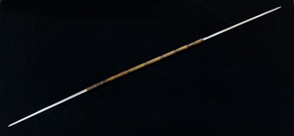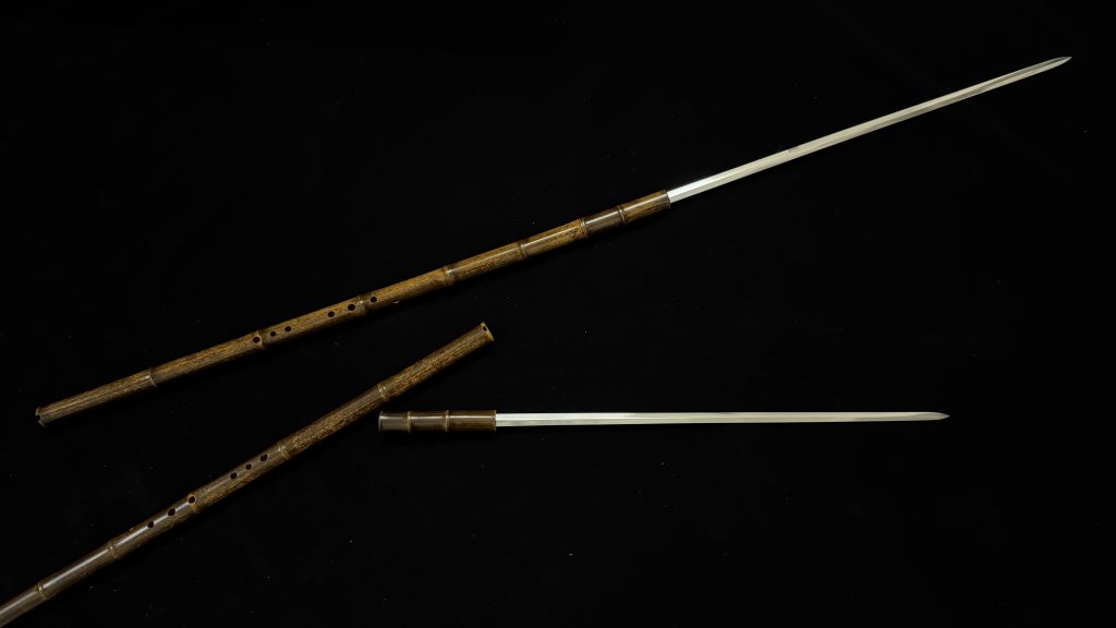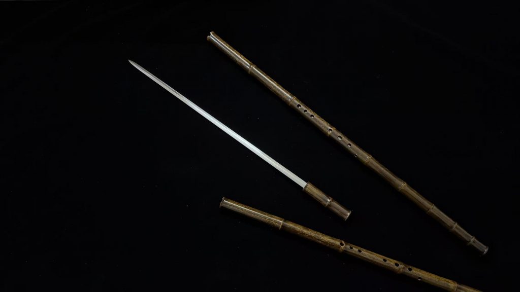 竹箫、剑、鋋三位一体奇门兵器,属于终极形态的竹中剑。尺寸均为预估,单只箫长 90,四面剑长80,反接鋋 长150,双剑对接200。适合装造佩戴、把玩、砍草、投掷等。