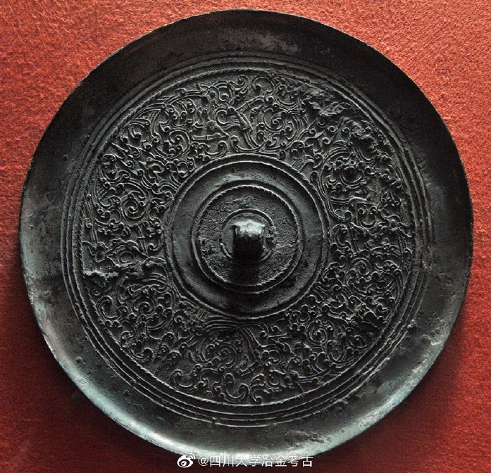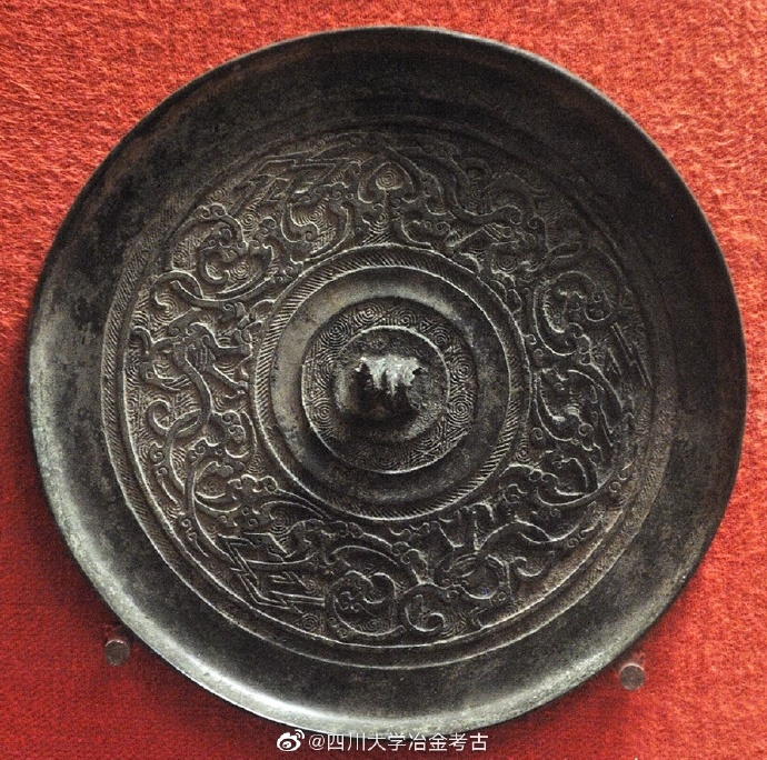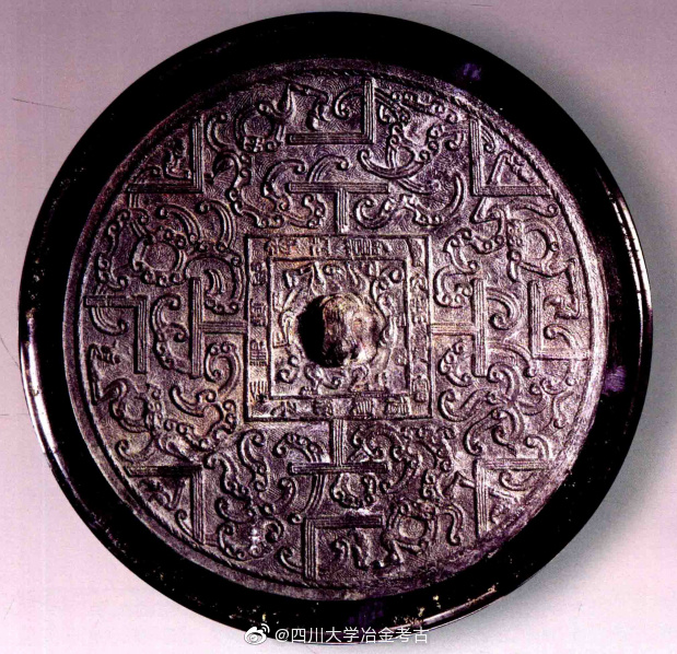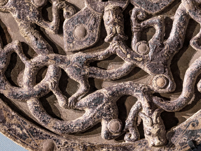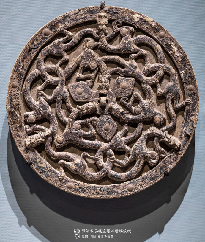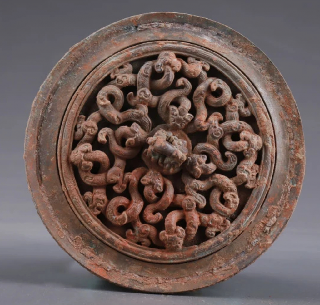 上图中铜镜中,龙形生物相互交错盘结,被成为蟠螭。需要注意的是,要和蟠虺纹区分开。