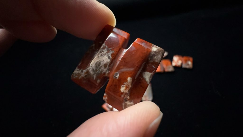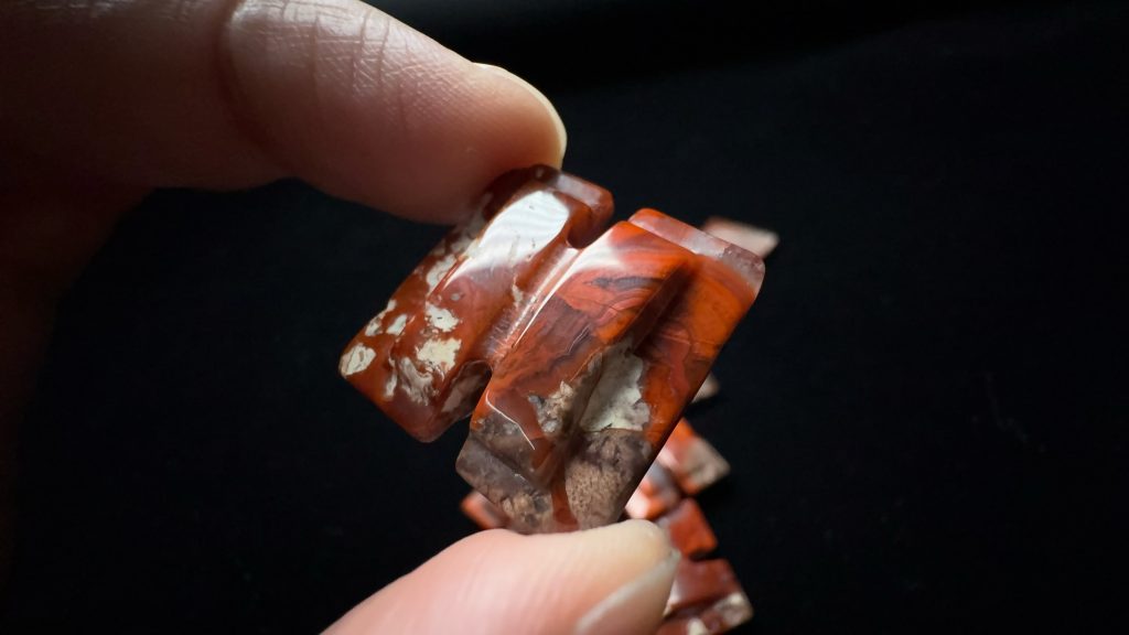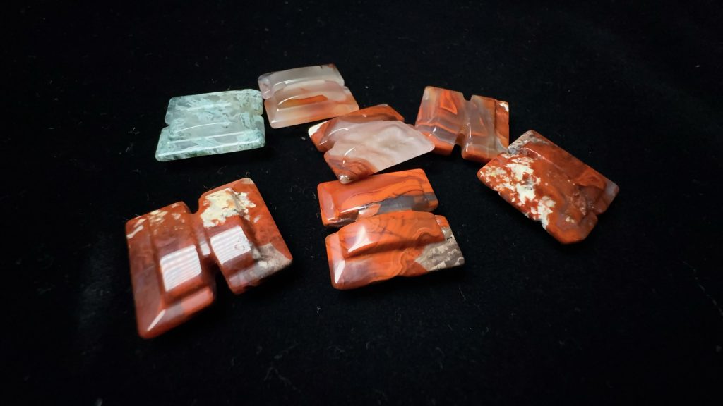 玛瑙工字佩一组,六个战国红,一个水草