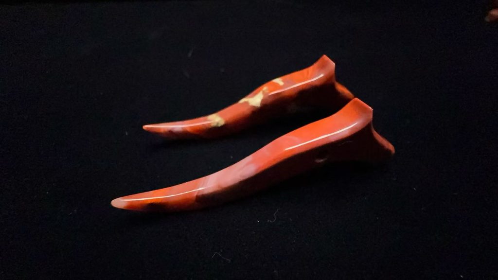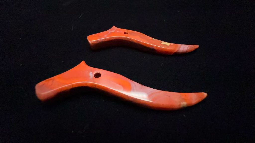 以上几支觿,均使用战国红制作,仿古细节包含表面打磨抛光牛毛纹、对孔台阶等,属于送礼、自用佳品。
