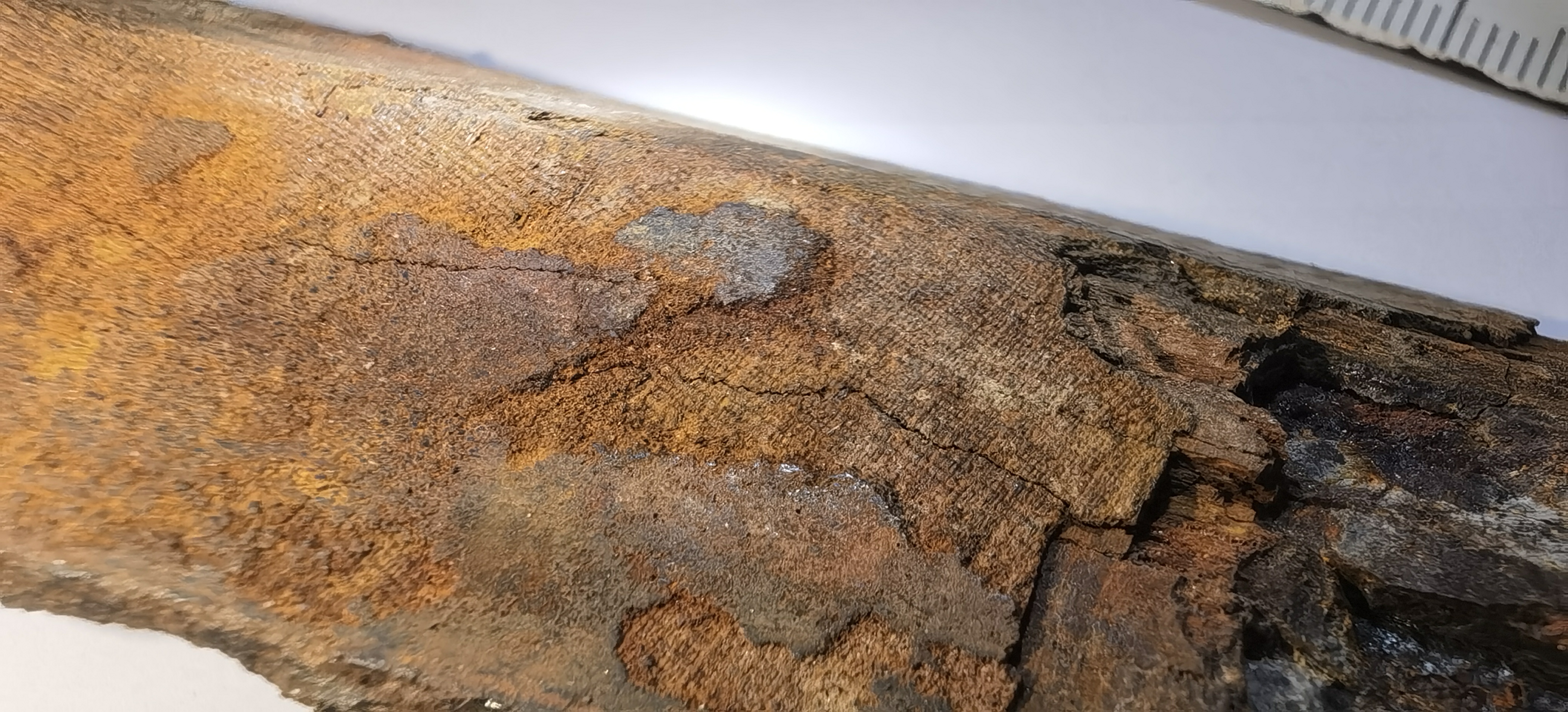 1,从断面可以看出剑鞘木胎已经碳化腐烂,木胎上面裹了一层布,布孔里面有瓦灰(参考同时期漆器考古报告)填充,瓦灰有黑色物质,应该是刷的大漆,