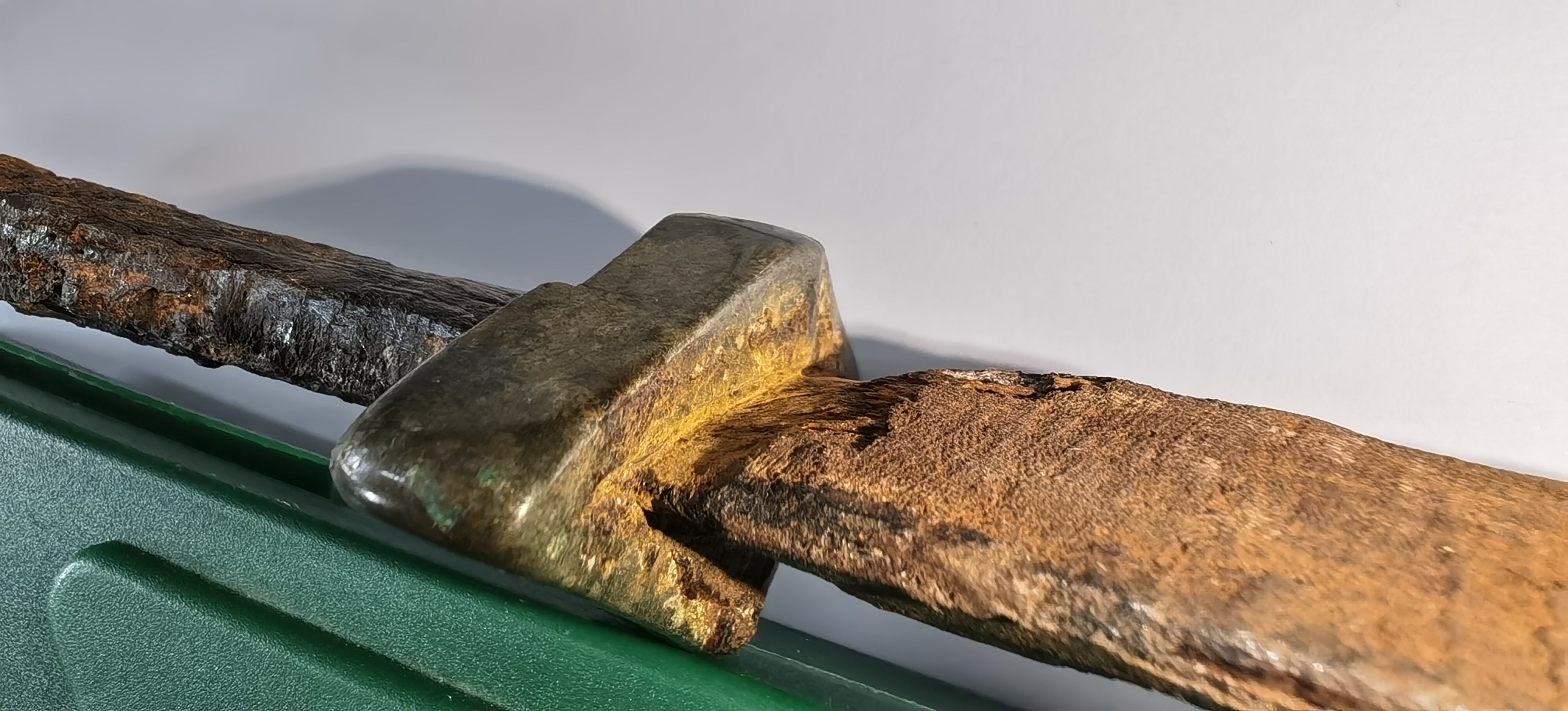 手里的一节残剑标本,上面还能够看到带有一些剑鞘细节
